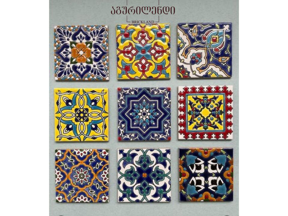 Handmade glazed ceramics with various designs, sizes 10×10; 15×15 or 20×20